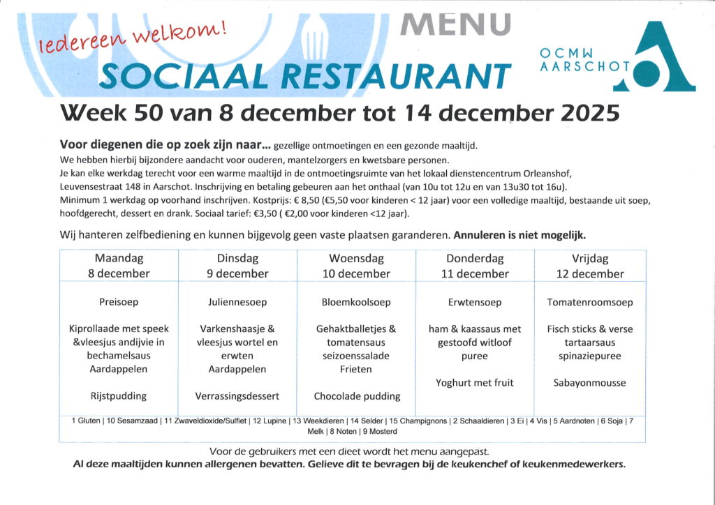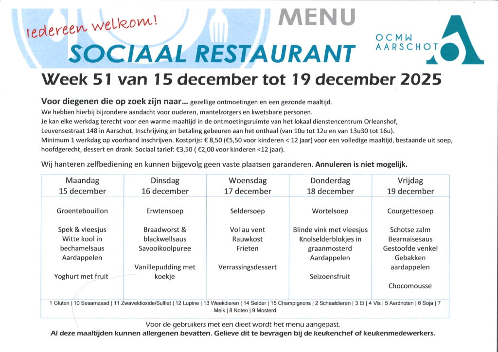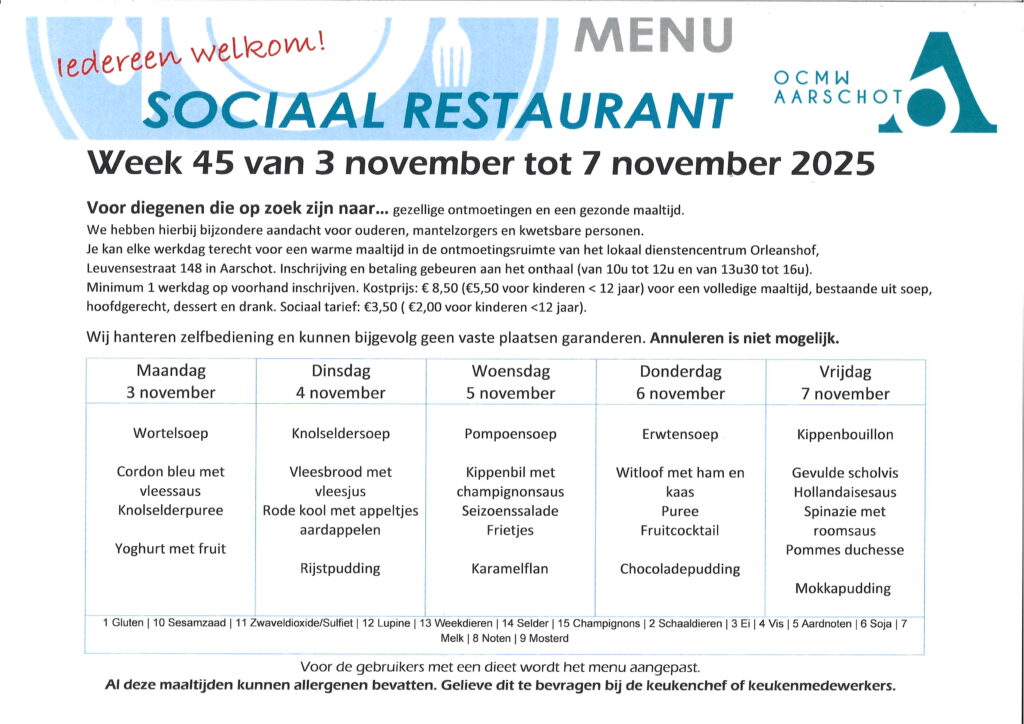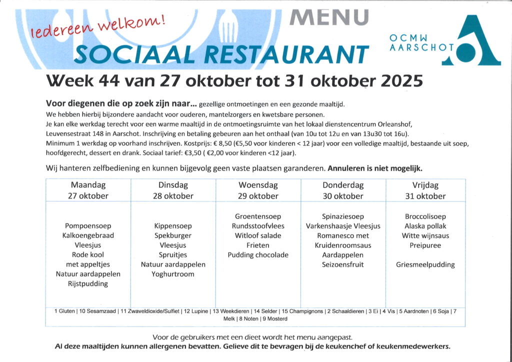 Sociaal tarief in het sociaal buurtrestaurant Orleanshof: 3,50 euro (2 euro voor kinderen <12 jaar ). Een uitpas met kansentarief is te bekomen ,na sociaal financieel onderzoek, bij het Sociaal Huis te Aarschot.