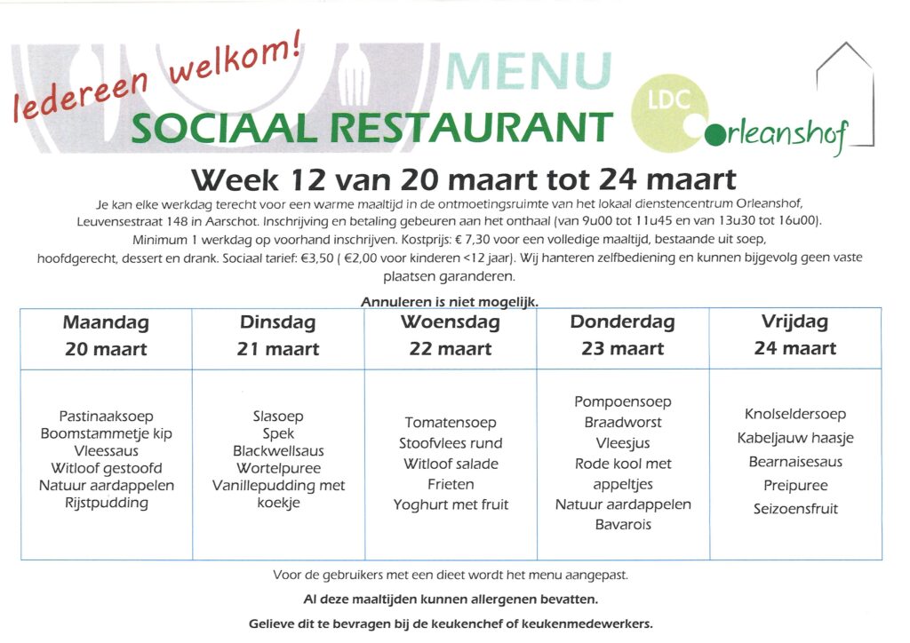 Sociaal tarief in het sociaal buurtrestaurant Orleanshof: 3,50 euro (2 euro voor kinderen <12 jaar ). Een uitpas met kansentarief is te bekomen ,na sociaal financieel onderzoek, bij het Sociaal Huis te Aarschot.